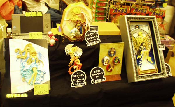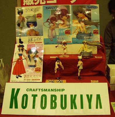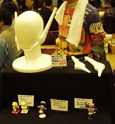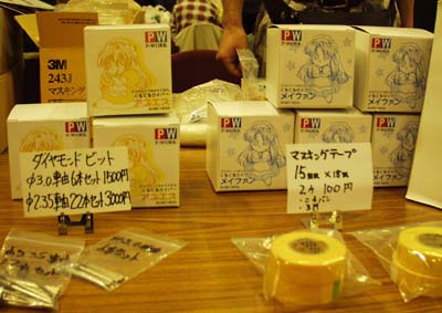 P−WORKS(ディーラー名は「首都高NS400RR」)。 関西では初めての参加と言う事になるのでしょうか? デスクトップのメイドさんくるくるセイバーシリーズ (HEXAサイトのダウンロードコーナーを参照されたし) は改修が加わっていたとの事なのでアニエスとメイファンを買ってみました。 オマケにマスキングテープや塗料ろ紙、使い方不明のリューターの先端ビット (円錐の底辺が先端来る形状の物で「何に使うんですか?」と聞いた所 「よく分らないのですが、一杯有ったのでとりあえず持って来て配ってます」との事) も頂きました(多謝)。 コスプレさん用なのでよく分らないのですが、 少し組み立てるだけで完成する塗装済みセリオ耳(センサー)の半完成品5,000円(キットは3,000円) はかなりお買い得感のある商品だと思う。 |