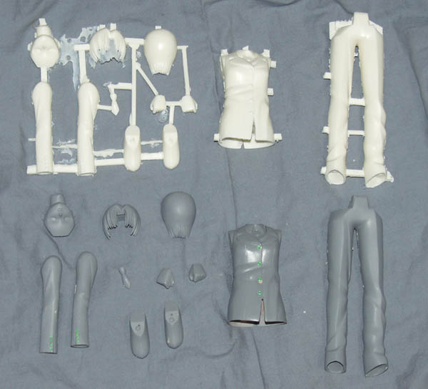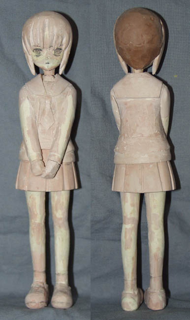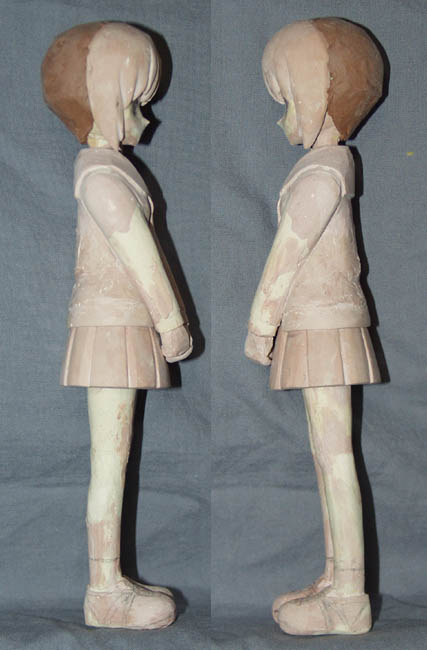 バゼットに続く新作です。イベント案内で書いているのでバレバレですが、キャラクター名は自主規制中と言う事で。 制作方法はバゼットに準じた物で、フレックスロッドとエポレジンで芯から大まかな形を作り、ポリパテで細かい部分を作っています。 後ろ髪の茶色い部分はインダストリアルクレイ(アルテ65)、前髪が完成してから、再度ポリパテで作り直す事になります。 |