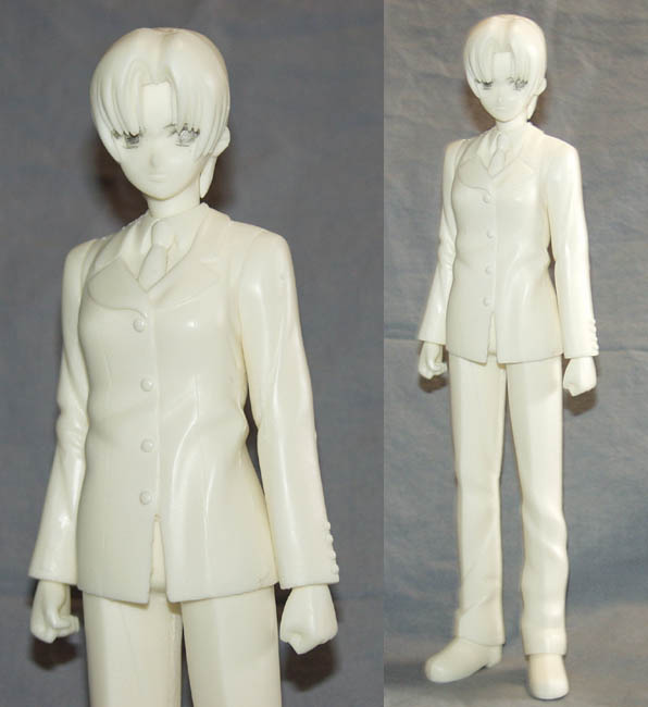 | レンに引き続きいきなり完成状態ですが、Fate/hollow ataraxiaの主人公のバゼットさんです。 詳しいキャラクター紹介はキット製作記事に譲るとします。 白いのがレジンキャストで複製した物で、グレーの物が原型です。 製作は2006年の正月からで、4月の末のワールドホビーフェスティバルに向け制作を始め、完成見本は間に合わなかった物の、原型は何とか完成して、販売も行えました。 モチーフはゲーム中の立ちイラストを再現しています。 ゲーム中のイラストが豊富なので資料には困りませんでした。 製作に使用した材料は、芯にモデラーズのフレックスロッド(3mm)を使い、全体のポーション決めから着衣の一部まで エポレジンプロは年末にポークスで売っていた物を試しに買った物ですが、量あたりの単価が安く、硬化後は他のエポキシバテの様に粘りが無く削り易く、刃物ではレジンパーツよりもスパスパ切れ、盛り付けの際にやたらにベト付くのを除けば、削り出しで整形する私にとっては欠点らしい欠点の無い素材です。 ネット上やイベント会場では「硬くて切削性が良く無い悪い」という話を聞くのですが、オルファの特選黒刃を取り付けたカッターナイフや曲線刃を付けたアアートナイフプロ、数種類有る彫刻刀を使っている限りは刃通りの悪さは全く感じず、切削性の良いロックペイントのクイックパテ120HBの硬化後よりも切削性は良いです。WAVEの 全体の大まかな形が出来た所で、スラックスの上端の部分を 頭は顔と耳が有る程度出来てから、前髪が生えている部分をホビーのこで切り落とし、顔パーツ部分にメンソレータムを塗ってから、hポリパテ(クイックパテ)を盛り付けて前髪となる部分を造り、前髪を大まかに整形した後に、頭後ろ半分の髪の毛部分をノコギリとナイフで切り落としリューターと耐水紙やすりで整形を行ってから、メンソレータムを塗り、ポリパテを盛り付けて切り出しと削り出しで整形しています。 前髪や後ろ髪の細かい部分は、幅の小さい平刀と印刀、エッチングソー、金属ヤスリで造形して行き、240番から400番の紙やすりの削り出しで仕上げています。 上半身はブラウス(Yシャツ?)までをエポレジンを使い、スーツ部分の造形と表面処理はポリパテで作りました。裾の部分はスラックスが有る程度出来てからスラックスに内側の型となる様に 袖の部分は肩口の分割部分で切り落とし、メスダボを作った後、切り落とした部分を参考にしつつ、ポリパテを盛り削りで作り直しています。手首も同様にポリパテの削り出しで作りました。 溝状のモールディングは鉛筆で書いた線をアートナイフプロの曲線刃でなぞり、それを金属ヤスリでさらになぞって仕上げました。 ボタンは表面処理が終った後、ウエーブのH-アイズ3 ミニ2.8mmと2mmを使用しました。2mmは4つしか入っていないので、2セット使っています。 下半身のスラックス部分は先に足首の靴の部分を作ってから切り離した後、エポレジンプロを盛り付け形を作って行き、シワやや折り目の表現と、表面処理をポリパテで行いました。 足と足の間の内側部分はそのままでは作り難いので、左足を付け根付近で切り離して表面処理の段階まで進め、当初は別パーツを考えて合わせ目部分のダボまで作っていたのですが色々考えた末、接着して一体化しました。 表面処理は基本的にポリパテで行っていますが、細かい気泡や凹凸はどうしても見逃してしまうので、ボークスのグレーサーフェイサーを噴きつけてはヤスリ掛けやポリパテの充填を行っています。 サーフェイサーを噴き付ける前にはプライマー(塗料接着剤)を噴き付けています。 複製用の型は何時も通りボークスのEXシリコンか、その同等品の旭化成のワッカーシリコンRTV2 M 8012を使用しています。 手法は前回同様、粘土型で、使用した粘土はほいく粘土、型枠はボークスの型枠専用ブロックを使用していますが、今回は型枠ブロックが足りなくなったので、一番大きな型枠にはベニヤ板を使用しました。シリコン同士を癒着させない為のコートは缶スプレーのMr.カラーのスーパークリアー半光沢です。 ![]()