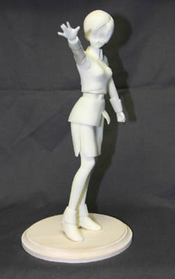 1/7ハーディ・ニューランド 上記三点はワンダーフェスティバル2008{冬}向けに製作した物で、現状では最新の作品です。 原型製作の材料は、芯材から仕上げ直前までの造形は、WAVEの 細かい凹みや傷はホルツの自動車用のプライマーサーフェイサーを噴き付けつつ、大きい凹みや傷はロックペイントのポリパテで、小さい凹みや傷はタミヤの白いラッカーパテで埋めて行きました。 ラッカーパテで白を使うのは、盛り付けた後に研磨する際に、充填箇所以外を十分に削り落とせているかを確認し易いからです。 造形に使った工具はオルファのアートナイフプロの曲線刃と直線刃を主に使い、補助的に各種彫刻刀を使用しています。前髪の裏を成形するのにはリューターを使いました。 彫刻刀に関しては、色々な銘柄や形状を持ち合わせていますが、主に使うのは幅が1.5mmと3mmの平刀で、それ以外は殆ど使いませんでした。 溝モールドはアートナイフプロでアタリ線を引いてから、ハセガワのエッチングソーで仕上げています。 かがみとこなた、みなみの前髪の製作は、顔一面にまでパテを盛り付けて、そこから削り出していましたが、イメージする形にすべく盛り削りを行ったら時間がやたらに掛る上、最初に盛ったパテが殆ど無駄に終り、後半からは細く伸ばしたエポキシパテを少し時間を置いて硬化させてから瞬間接着剤で貼り付て髪の毛の房の芯を作る方法に変更しました。ハーディは最初から後者の方法で作ったので、他の三体と比べて、髪の毛の造形に関しては随分早く仕上がりました。 らきすたアイテムは素立で、制服姿の柏葉巴やバゼットを作った際にも感じたのですが、両足を均等な長さに造形しないと不自然に傾いてしまうのですが、これが中々難しく、この調整に相当の時間を費やしました。 芯材段階で両足の高さがきちんと揃っていても、分割して、分割箇所の成形を行った後では長さが微妙に異なり、その微調整の為には、足首全体を盛り削りして行かねばならず、何度も思考錯誤した結果、足首を一から作り直して、元の足首は切り捨て、新しく作った足首を真鍮線でつなぎ合わせて高さを調整して何とか仕上げました。 らきすたアイテムに関してはペナルティー回避の為に完成させるのが最優先だった為、造形的には不満点が多く、夏のイベント向けに改修しようと考えていたのですが、本年度からイベント品の販売は一回だけしか出来なくなったのと、版権料の高さから見送りました。 ハーディに関しては、別キャラでボーズも違い、ブーツのデザインも異なるのですが、既に一度作ったパイロットスーツだったので、特に悩む事無く進み、らきすたアイテムほど苦労した印象は有りませんでした。胸の周りが技量不足で布の様な感じが出せなかったのと、正面からみた際に口が小さ過ぎる感は否め無い所は残念でしたか、概ね気に入っています。