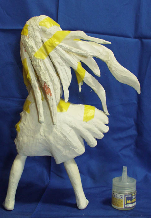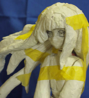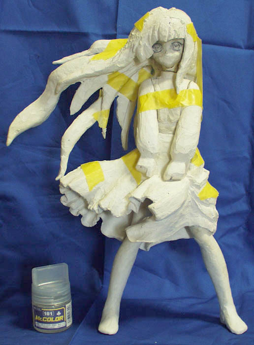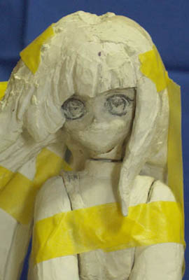 今回は前回「またの機会に」とした先行している物です。 タイトルやキャラクターは今回も伏せておきますが、ロリ(子供)キャラです。 作業は芯材を含めてニューファンドのみで進めていたのですが、 限界が見えて来た為、写真には殆ど写っていませんが、 ポリパテ(ロックペイント クイックパテ120HBの主剤にスベスベ専用硬化剤)を使い始めました。 第一回と同じ様に頭から作り初め、 胴体と両足は 棒状に乾燥させたファンドを芯材にして瞬間接着剤で張り合わせてからは ファンドの盛り削りの繰り返しです。髪の毛もほぼ同様です。 腕は適当にファンドを盛り付けて適当に削りだしただけの状態で、 手首はスカートの形状待ちです。 スカートは胴体と両足の形がある程度出た段階で、 油粘土を盛り付けてスカートの大体の形を作り、 張子の様に水分を含ませ薄く延ばしてたファンドを何層か張り合わせて ある程度強度が出た段階で油粘土を取り除き、 その後は他と同じく盛り削りの繰り返しです。 構造上スカートの形を早く決定しなければならないのですが、 複雑な形状の為、二重構造の内側、ペチコートの製作の段階で留まっています。 製作中の下半分をペチコートに使い、上半分はスカートにする予定で、 スカートに形状の面からも干渉しない段階まで来ているので、 分割、スカートの製作に入っても良い頃なのですが、 ノコギリで分割するのが面倒で・・・ これは髪の毛にも同じ事が言えるのですが、 何処まで薄くすればそれっぽく見えるのか、如何にして薄くするのか、 皆目見当が付かないのが難しさの要因では有るのですが、 そもそも初めて作る物にスカート物を選んだのが無謀と言う話も有ります。