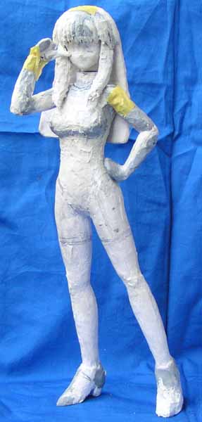 要は迷走していた訳です。 現在は第1回目に掲載した物が何となく完成し易そうと言うアバウトな理由でキット製作の合間のマンパワーを投入しているところです。「初心忘れるべからず」と言う奴ですね。 第1回から時間が経過している事も有り、前回には無かった部分がかなり追加されています。まあ、後髪以外はココ2週間での作業と言うのは秘密ですが・・・ 当初は総ファンドでの造形を試みたのですが、硬化待ちの時間が余りにも長く、右腕の肘から手首迄をを盛り付けるだけでも一日仕事で、これでは永久に完成しそうも無かったので、ポリパテとエポキシパテを投入しました。エポキシパテは混ぜてから30分もすれば十分に硬化するものなのですが、 均一に混ざり切らないのが悪いのか、ナイフ等で切り出すとポロポロと崩れるので、大まかに切り出した後は、使い慣れたポリパテでの盛り削りで最終的な形だしをする方法を採っているのですが、今の所これが最も高効率の様です。 ![]()