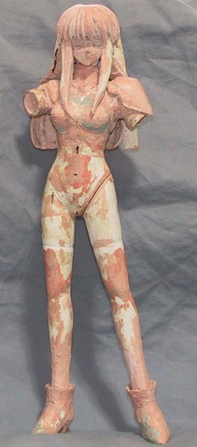 左の肩当もあるのですが、左肩の形状を変更した為、合わなくなったので、両腕はタボをまだ付けていないので、写真を撮影した時点では取り付けていませんが、パーツその物は有ります。 前回から2ヶ月半経過しているので、色々変っているのはぱっと見で解って頂けるかと思います。 作業内容はパリパテを盛り付けて、ナイフやリューターで削るのを、ああでも無い、こうでも無いと繰り返すのみです。 居るかどうかは分かりませんが、元絵を見た事の有る人なら誰だか解って頂けるのでは無いかと思います。 12/7 ’03