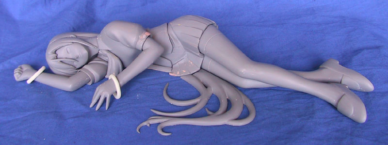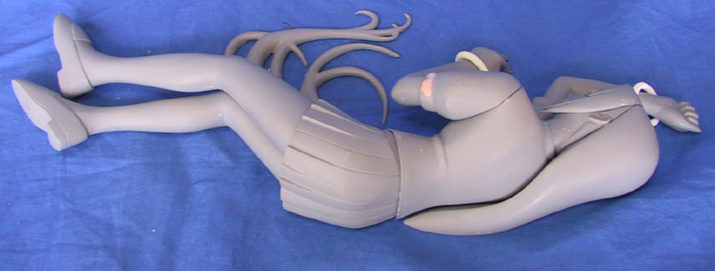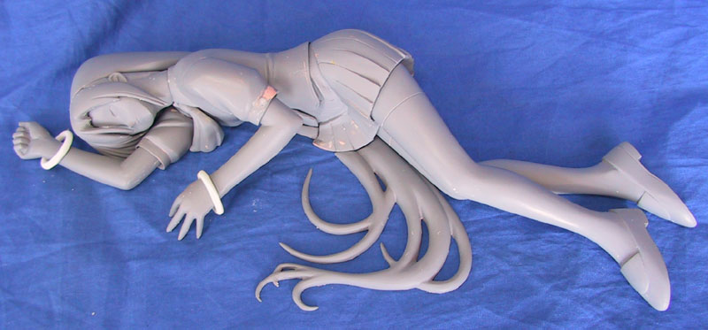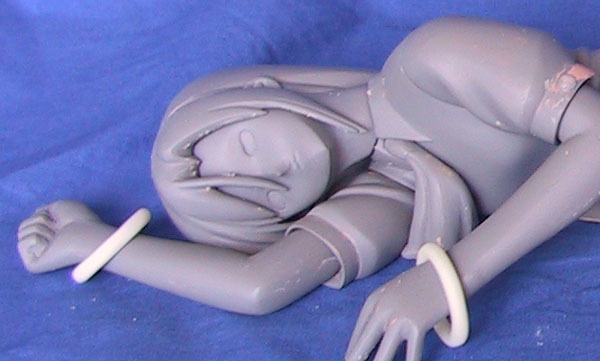 白い物は、シリコン型を作る際に付着したバリアコート(シリコン用離型剤)と粘土で、パテ地が出ているのは塗料接着剤を使用しなかったので、シリコンにサーフェイサーが持って行かれた為です。