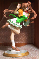 今回のアイドルタイプ制服でAGGRESIVEのともみを制覇。と思ったらPiaキャロ3で不採用となった制服のともみが冬のワンダーフェスティバルで出たみたいですが、Piaキャロ2版のともみは一応一通り作った事になります。 初めてこのアイドルタイプのともみを見たのはレプリカントだったと思うのですが、第一印象は「面倒臭そう」でしたが、そも第一印象通り塗装が大変でした。 キットの購入は去年の夏のワンダーフェスティバルで行いました。 塗装までの下地処理等 塗装までの段階は左足の外側に気泡が結構有ったので、一つ一つ埋めていたら莫大な時間が掛かると判断して、気泡の有る部分にはキャストの色に近いポリパテを馴染む様に薄く盛り付けて消したのと、スカートとペチコートの部分のパーティングラインが面倒なのを除けば、大きな欠損や、バーティングラインやゲート処理した段階でパーツが合わないと言うは無かったので、取り立てて大変な部分は有りませんでした。時間さえ掛ければ誰でも完成まで辿り付けると思います。 塗装の前の仮組みで、真鍮線で各部分を繋ぎ合わせる際に、首と胴体、胴体とスカート、下半身部分の固定には強度が必要なので1.5mmの真鍮線を打ち込んでいますが、それ以外の部分は全て1mmの真鍮線で固定しています。髪の毛の固定には1mmを二本づつ、首と胴体の固定には1mm、1.5mmを一本づつ打ち込んで回転しない様にしてあります。ベース固定用の穴も、この時点で空けておきました。 真鍮線を打ち込む位置決めですが、先ず片方のパーツにドリルで穴を開けて、真鍮線を刺して、ニッパーで引っこ抜けるぎりぎりの所で真鍮線を切断、もう片方のパーツを押し付けて、付いた真鍮線の跡をガイドにドリルで穴を開けると言う方法を取っています。注意しないとならないポイントとして、真鍮線を押し付ける時にドリルで掘った穴よりも深く真鍮線が埋まるので、切断の際はそれを考慮して若干のマージンを持たせてやる事でしょうか。キャスト素材の具合で埋まる度合いも違いますし、長すぎるとポイントがずれたりするので難しい所ですが。 塗装の際の支持棒として1mmや1.5mmでは強度不足と考えられる部分には、固定用とは別に1.5mmや2mmの支持棒用の穴を空けています。まあ、支持棒に真鍮線よりも強度の高いステンレスやスチール線を使うのも良いのですが、切断するのが大変なのと、支持棒用の穴を空けると仮組みの際に取り付けた真鍮線を抜く必要が無いのでオススメです。 下地塗装は、業務のプライマー を塗布してから、肌色部分の有るパーツは造形村ブランドのクリスタルクリアーを、それ以外の部分はクレオスの白さサフを、それぞれ噴き付けています。プライマーの前には、離型剤や作業時に手から付いた油分、細かい部分に入り込んだ、ヤスリ掛けした際に出た削り粉を落とす為、ラッカー薄め液を入れた缶にバーツを1分程度漬けてから歯ブラシで念入りに磨いて完全脱脂しています。 塗装 肌色は愛沢ともみver.4.5で使った物と同じ色で顔と胴体パーツに吹き付けてみたら、希釈を誤り、かなり濃い色になってしまったので、希釈を倍くらいに変えて他のパーツや、風見みずほを塗ったらそれはそれでかなり良い感じで仕上がったのですが、風見みずほ 宇宙服Ver.を塗装している時に肌色の入ったビンを倒してしまい、その際に色味の調整に入れているクリアーオレンジの成分が上澄みになって流れ出してしまったらしく、後日、顔と胴体パーツを塗ったら、他の部分とは似ても似つかない色に仕上がってしまい、クリアーオレンジを足して再調合するにしても色味が合う可能性は低いので、確実な方法として、肌色を塗ったパーツ全てをシンナーで塗装を落として下地から全て塗り直しました。 最終的な肌色は、ビンを倒して色味が変わった肌色に、クリアーオレンジと、隠し味程度に蛍光オレンジで色味を調整した物を吹き付けています。髪の毛や服を塗ると、肌色を塗った時よりも肌色が薄く見える物で、「少し濃すぎるかな?」と思うくらいでは、他の色を塗ったら薄すぎる肌色になってしまいます。それを計算して、肌色を塗る時は濃い目に塗ると仕上がった時は良い感じになってくれます。私は面倒なのでしていませんが、髪の毛や服に塗装する予定の色を、プラ板か何かに塗った物を予め用意しておいて、それと比べながら肌色を塗るという方法も良いかもしれません。 肌色だけの塗り直しはそれ程苦痛では無いのですが、目のシャドーと虹彩を先にマスキングして塗っている顔パーツを2回塗り直すのは結構キツイ物が有りました。まあ、肌色を塗ってから目を塗れば?と言う話も有りますが、目を先に塗る法がマスキング漏れで失敗する確立を下げる事が出来るので・・・・仕上がり自体は中々良い感じで、気に入っているので良しとします。 ポリパテを盛り付けた部分はいつも通りに、塗装の段階でキャスト素材に近い色に調合した塗料を吹き付けて